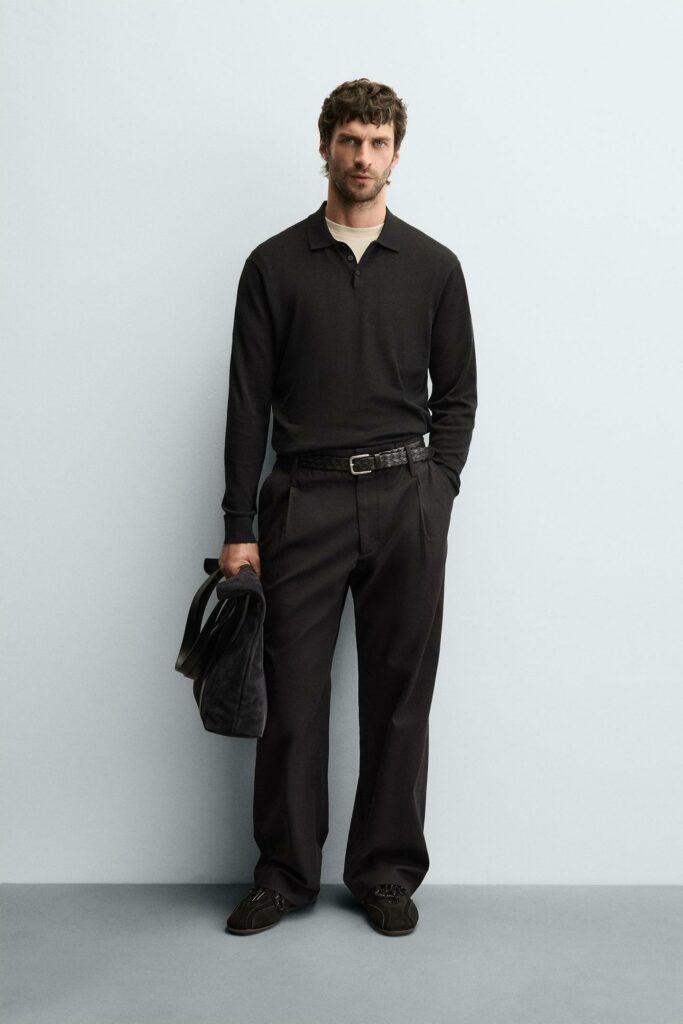 Un look de jour comme de nuit. Le polo apporte la touche chic, le pantalon structure l’ensemble. Simple, élégant, efficace.
