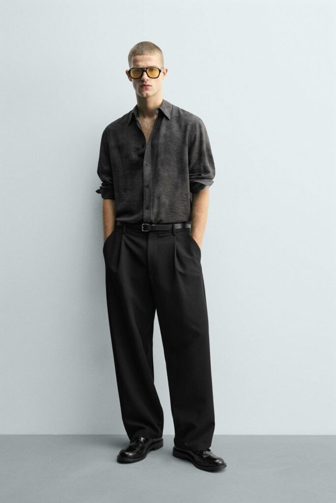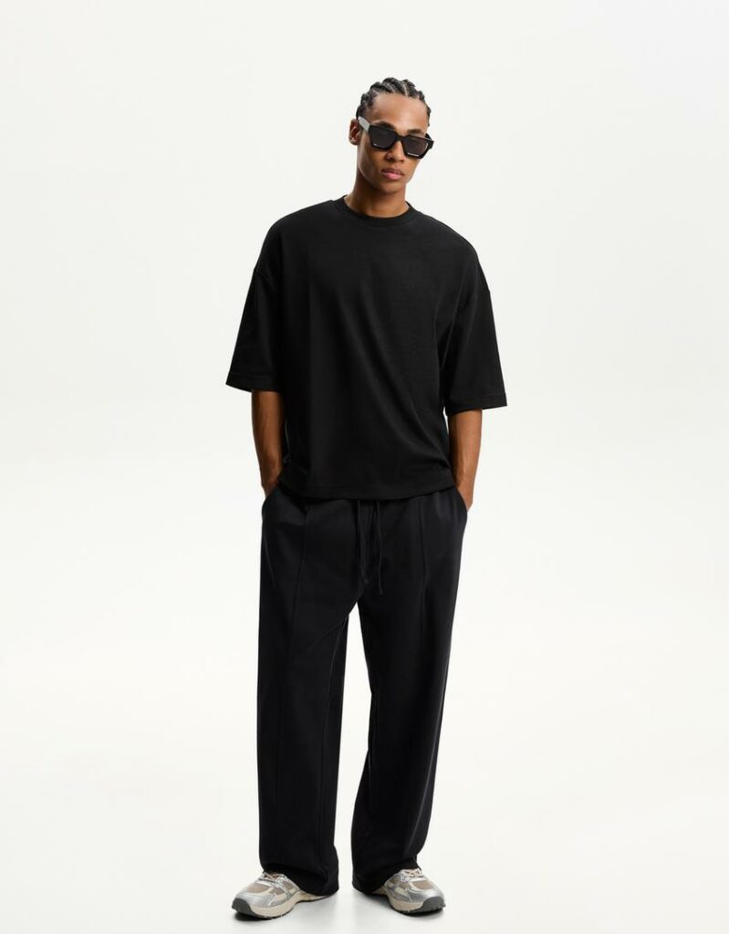 Minimaliste mais sophistiqué. Un t-shirt noir bien coupé et un pantalon à pinces créent une silhouette contemporaine. Sneakers pour la journée, mocassins pour le soir.