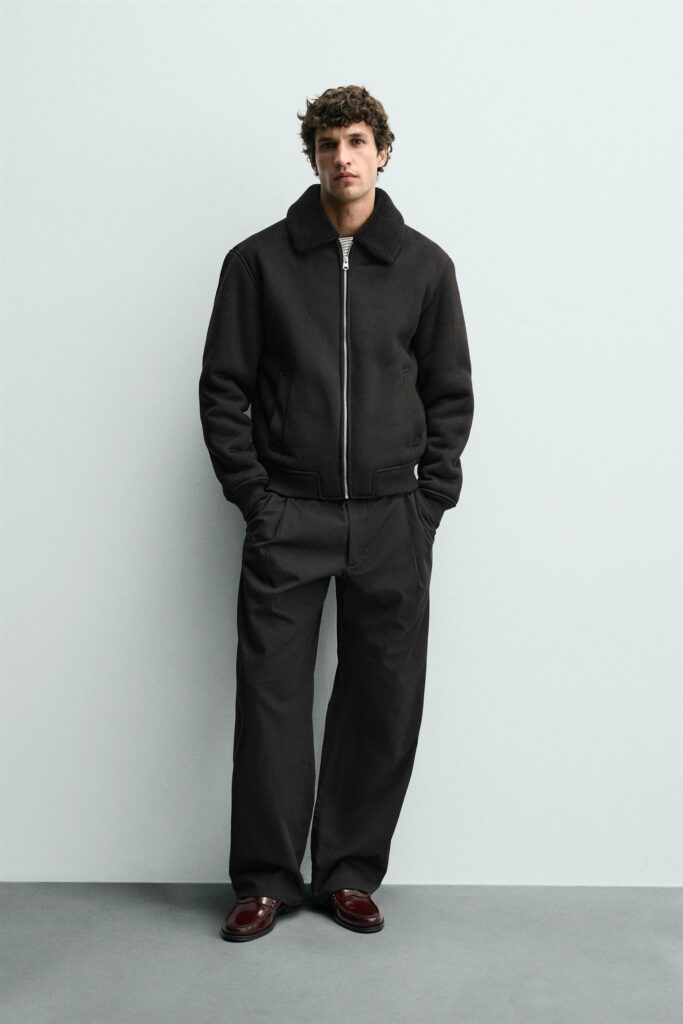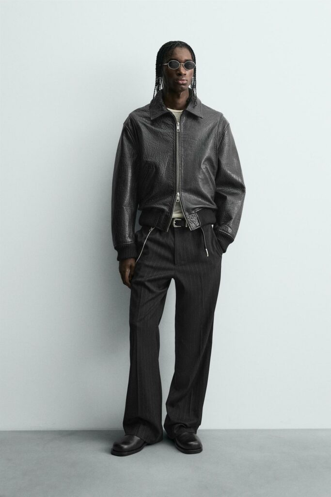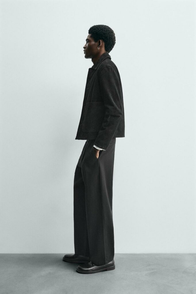 Le noir sert ici de base neutre pour mettre en valeur la veste. Le résultat : une tenue simple qui gagne instantanément en caractère.