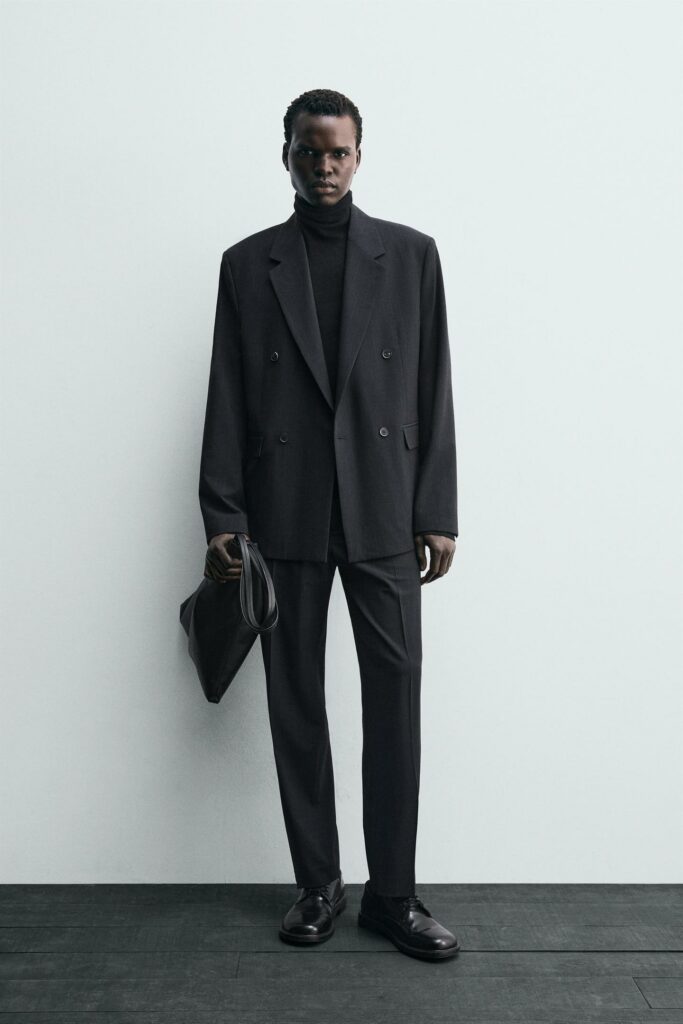 L’alternative élégante à la chemise-cravate. Le col roulé noir, glissé sous un costume sombre, crée une allure sobre et puissante.